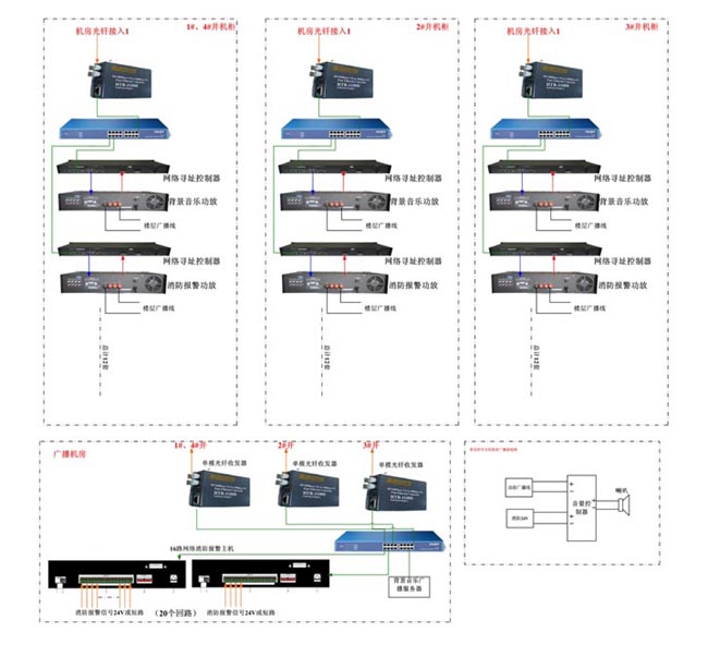 泰州碧桂園五星級大酒店位于江蘇省泰州市海陵區(qū)泰東河大橋北側(cè),地處生態(tài)旅游區(qū)。本次廣播設(shè)計(jì)安裝全金屬音箱1265只,按照功能分為40個(gè)區(qū)域,每個(gè)區(qū)域同時(shí)播放不同背景音樂;設(shè)置中心主控機(jī)房一個(gè),分中心機(jī)房4個(gè);廣播系統(tǒng)與酒店消防報(bào)警系統(tǒng)聯(lián)動實(shí)現(xiàn)N-3、N-2、N-1、N、N+1、N+2、N+3報(bào)警。